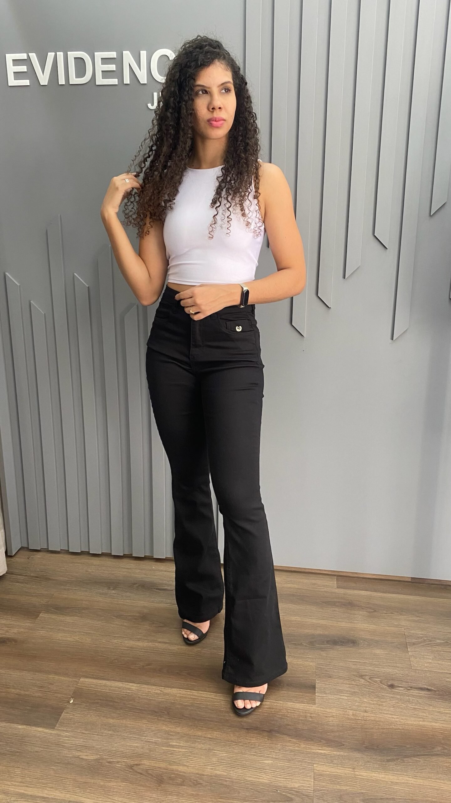 Com modelagem flare, alonga as pernas e traz um toque sofisticado ao visual, sendo uma peça versátil que transita facilmente entre o casual e o elegante.